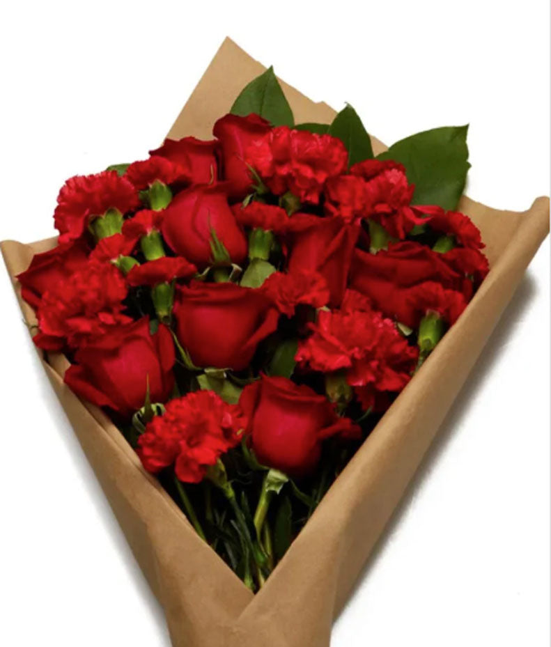 Beautiful wrap with 6 red roses and 6 red carnations with greenery.